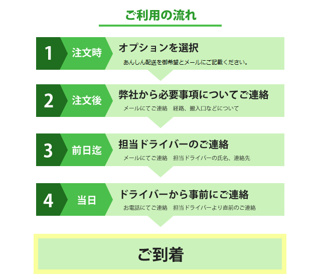 当日配送に伺うドライバーの名前と携帯電話番号をお伝えいたします。